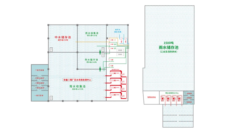 “雙童”在廠(chǎng)區道路、屋頂、綠化地等可以收集雨水的區域建造了一百多個(gè)雨水收集口,并用管道分別連接到各個(gè)廠(chǎng)區的雨水儲存池里,這幾個(gè)池子總量相加為4500噸!