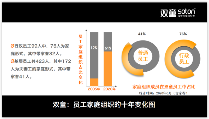 雙童早期團隊的很多成員,都是在公司內部找到自己的人生伴侶,并生兒育女、組成一個(gè)個(gè)小家庭,逐漸形成雙童特色的“家文化”。在這樣的企業(yè)文化下,很多員工早已把公司當成了“第二個(gè)家”。生活在“雙童”大家庭的一個(gè)個(gè)小家