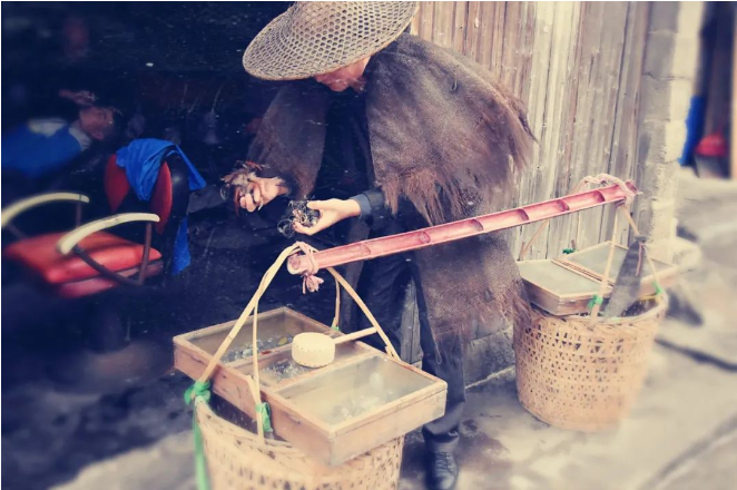 挑“貨郎擔”用的扁擔和一般的扁擔是不一樣的,杉木扁擔很軟,挑的過(guò)程當中會(huì )很有節奏的搖起來(lái)。