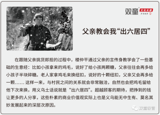 1979年時(shí)期的“雞毛換糖”,義烏廿三里已經(jīng)形成了提籃市場(chǎng)。所以我去挑貨郎擔時(shí)已經(jīng)不再是簡(jiǎn)單的用糖去換雞毛了,而改用牛皮筋、發(fā)夾、紐扣等小百貨去換“雞毛”。我們“雞毛換糖”的地區主要是山區,通常我們都會(huì )4點(diǎn)起床,5點(diǎn)出門(mén),先走出去20多公里,趕三四個(gè)小時(shí)的路,然后到規劃當中最遠的村莊,一邊換雞毛一邊往回走。這樣一來(lái),雞毛換的越來(lái)越多,擔子越來(lái)越重時(shí),也離回家的路程越來(lái)越近了,從而也就減少了體力消耗。那一年的春節,半個(gè)多月的時(shí)間,雖然每天都要翻越百里路,道路崎嶇,路途艱險,但我自己并不覺(jué)得有多辛苦。磨破腳皮,讓我第一次真正賺到了十多塊錢(qián)?;丶乙院?,爸爸再怎么罵我,死活也不去上學(xué)了……