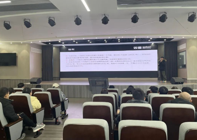 會(huì )議開(kāi)始后,總經(jīng)理助理李戎先對新員工們的到來(lái)表示了熱烈的歡迎,并從“組織架構”、“福利待遇”、“規章制度”三個(gè)方面,為新員工們解答了大家最關(guān)心的工齡待遇、超產(chǎn)獎項等問(wèn)題。