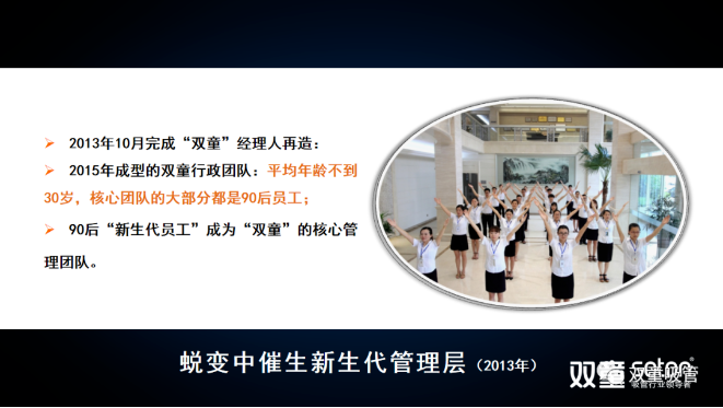 另一方面,新進(jìn)年輕人也能夠得到重用。2013年,“雙童”在完成團隊重組之后,管理團隊平均年齡不到30歲,大部分都是90后,在制造業(yè)企業(yè)來(lái)說(shuō),是屬于少有的管理年輕化。