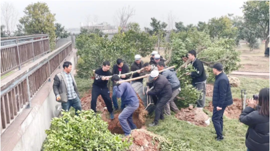 大家一起將大樹(shù)從搬運車(chē)上卸下來(lái)