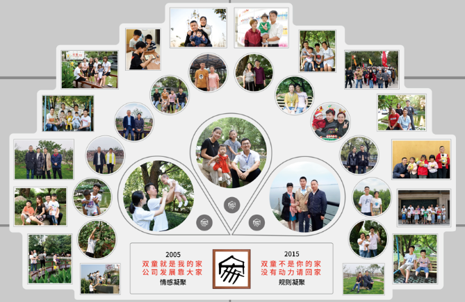 所以啊,“雙童”早期團隊里的很多成員都是內部消化的,大家在公司里找到自己的人生伴侶,并生兒育女、組成一個(gè)個(gè)小家庭,最后匯聚成“雙童”這個(gè)大家庭。久而久之的“雙童”家文化就貫徹在每一位員工心中,大家都把公司當成了“第二個(gè)家”。