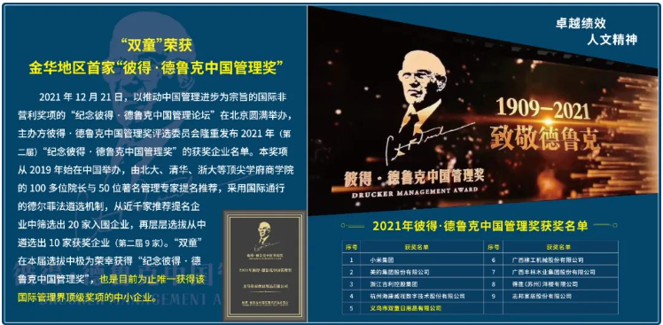 2021年12月21日,“雙童”榮獲金華地區首家“彼得·德魯克中國管理獎”。本獎項是由北大、清華、浙大等頂尖學(xué)府商學(xué)院的100多位院長(cháng)與50位著(zhù)名管理專(zhuān)家提名推薦,從近千家推薦提名企業(yè)中層層選拔從中遴選出10家獲獎企業(yè)?!半p童”是目前為止唯一獲得該國際管理界頂級獎項的中小企業(yè)。