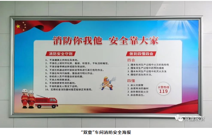 在“雙童”,各類(lèi)宣傳標識、消防器材隨處可見(jiàn),安全意識深入人心!正是因為“雙童”對安全生產(chǎn)的這份敬畏之心,才讓每一位員工心中都筑起了一道安全防線(xiàn)。