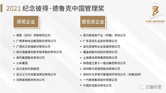 “雙童”三十年保持活力的源頭,就在于“小客戶(hù)原則”下企業(yè)核心競爭力的變化。目前,“小客戶(hù)原則”被收錄在國家案例庫里。在管理實(shí)踐中,“雙童”越來(lái)越能夠把握住企業(yè)特色,將經(jīng)營(yíng)哲學(xué)融入進(jìn)企業(yè)管理,并進(jìn)行開(kāi)拓創(chuàng )新,由此產(chǎn)生了越來(lái)越多經(jīng)典管理案例。2021年,“雙童”榮獲“德魯克管理獎”,成為中國唯一一家獲得該項榮譽(yù)的中小企業(yè)。