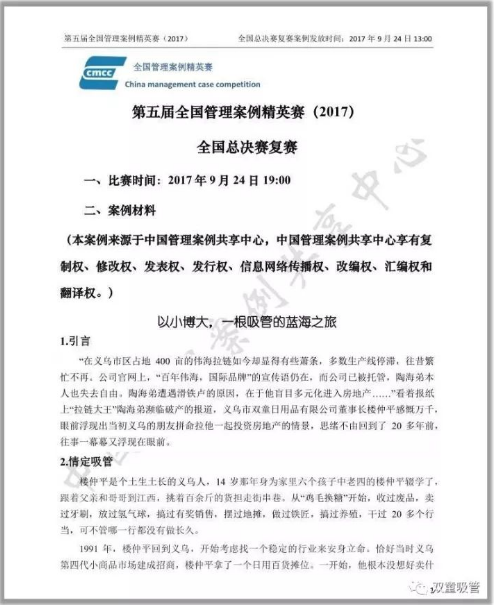 其中浙江工業(yè)大學(xué)和南京大學(xué)采編的管理案例分別被評為2016年和2017年度全國管理案例的百優(yōu)案例。在2017年全國管理案例精英賽中,《以小博大,一根吸管的藍海之旅》被指定為總決賽的PK案例。截至目前,以“雙童”為主題的案例進(jìn)入到國家案例庫的數量已有十多件。