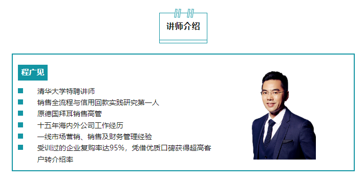 針對以上問(wèn)題,雙童商學(xué)院特邀銷(xiāo)售全流程與信用回款實(shí)踐研究第一人、知名銷(xiāo)售專(zhuān)家程廣見(jiàn)老師,授課【營(yíng)銷(xiāo)模式創(chuàng )新訓練營(yíng)】,通過(guò)五大模塊八個(gè)單元,更精準地幫助你的銷(xiāo)售團隊,找對方法,實(shí)現高價(jià)成交和快速回款的目標,最終促成企業(yè)銷(xiāo)售目標的達成,獲得更大的利潤增長(cháng)。