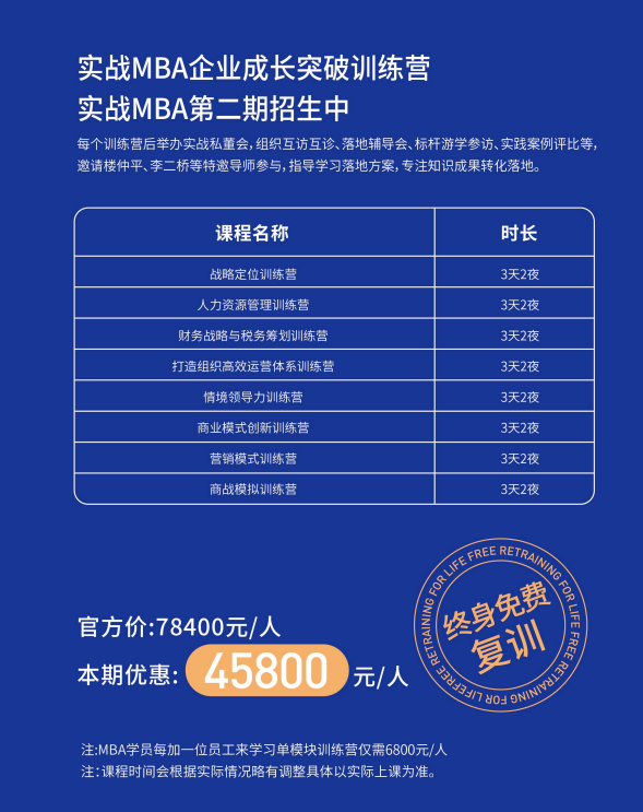 雙童商學(xué)院實(shí)戰MBA,摒棄紙上談兵,聚焦民營(yíng)企業(yè)實(shí)際經(jīng)營(yíng)管理問(wèn)題,即學(xué)即用,邊學(xué)邊練,現場(chǎng)生成落地改進(jìn)方案。MBA包含戰略定位、人力資源管理、情境領(lǐng)導力等八大訓練營(yíng),讓同學(xué)課上學(xué),課后用;今天學(xué),明天用!