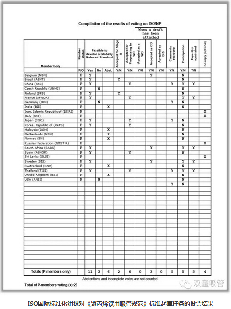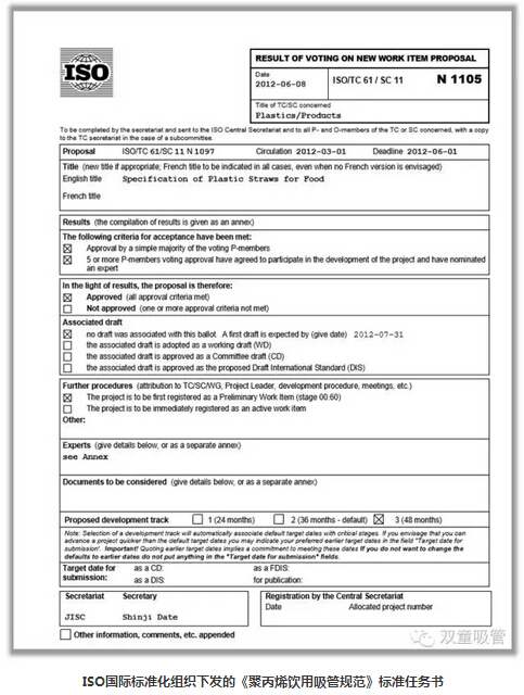 2008年7月,雙童在完成《聚丙烯飲用吸管》行業(yè)標準、國家標準的起草編制任務(wù)后,向ISO標準化管理組織申請了國際標準的起草制定任務(wù)。四年后,中國、泰國、瑞典、法國、南非五國組成的《聚丙烯飲用吸管規范》國際標準起草委員會(huì )成立。