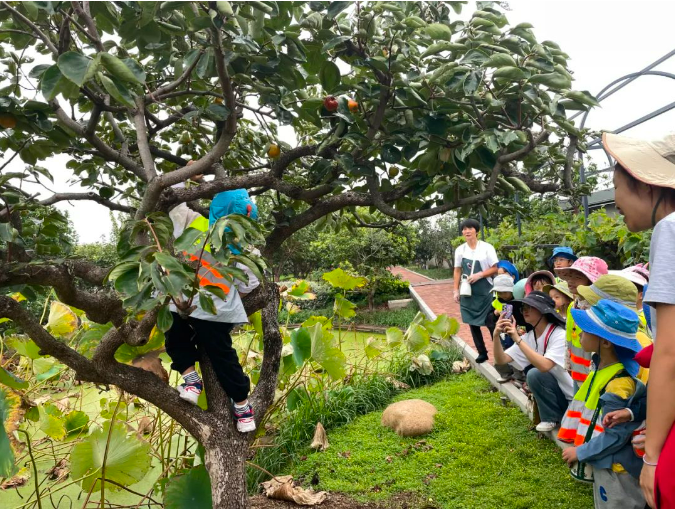后面講解員帶領(lǐng)小朋友們前往此次游學(xué)的最后一站——“雙童”空中生態(tài)園。在這里,“雙童”講解員輔助幼兒園老師將小朋友們分為三組,然后繪聲繪色地向小朋友們介紹著(zhù)“花園中”果樹(shù)的品種,通過(guò)故事性的表達讓小朋友們更加直觀(guān)地了解到其中的差別,也增長(cháng)了他們的自然知識。