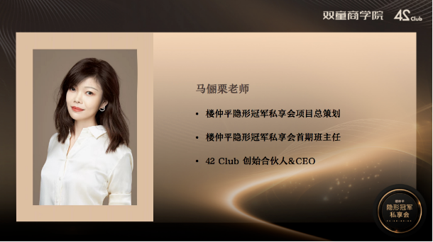 同時(shí)受樓仲平老師的邀請,42Club 創(chuàng )始合伙人&CEO馬儷栗將擔任“樓仲平·隱形冠軍私享會(huì )”項目運行總策劃人,以及項目交付的班主任老師。