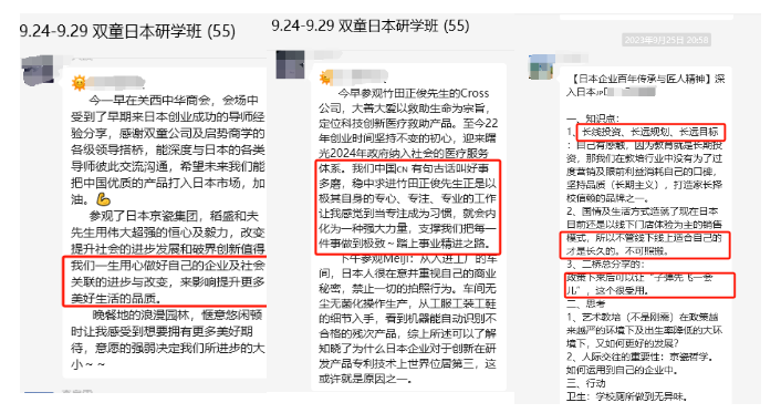 通過(guò)本次日本企業(yè)游學(xué)之旅,很多學(xué)員都深受啟發(fā),在貫穿研學(xué)全程的巴士課堂上大家暢所欲言,分享所見(jiàn)所得所想。無(wú)論是從巴士課堂上的分享發(fā)言、還是從形成文字感悟來(lái)看,都能看出來(lái)大家收獲滿(mǎn)滿(mǎn)!