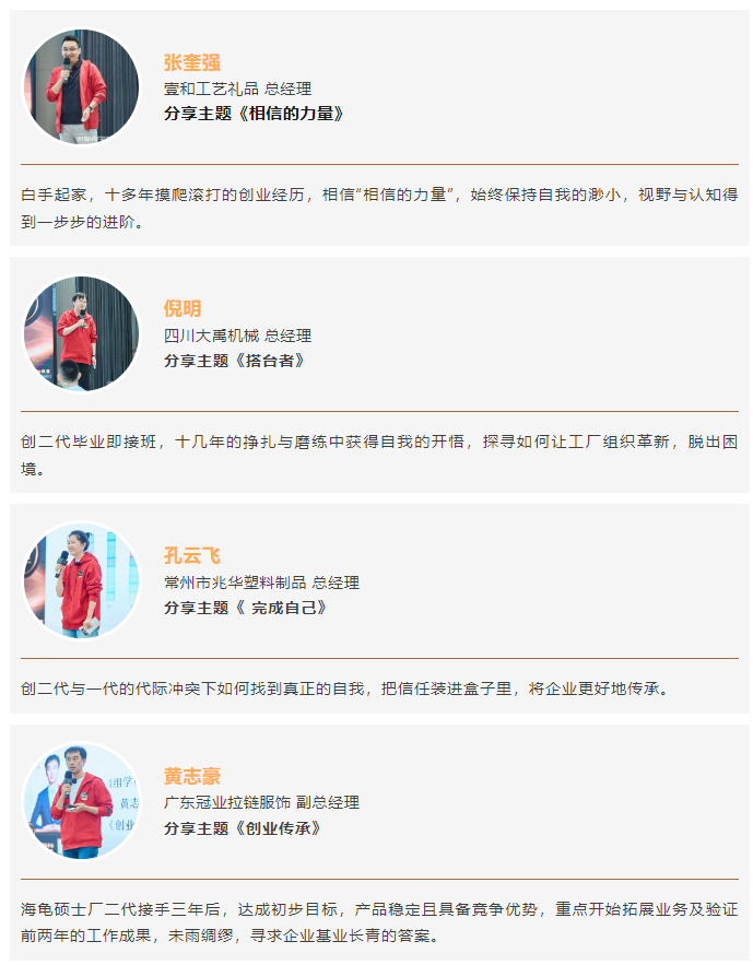 因此,在開(kāi)學(xué)典禮上,四位具有代表性的學(xué)員分享介紹了自己在企業(yè)經(jīng)營(yíng)的心路歷程,并表達了升級思維的期待,解決目前的企業(yè)傳承與轉型發(fā)展問(wèn)題。