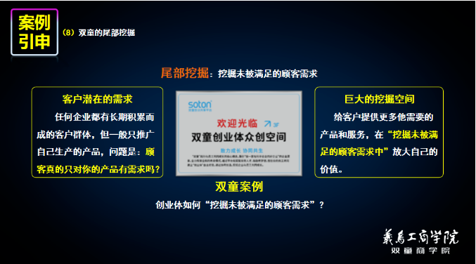 樓總認為“路徑依賴(lài)”是阻礙改變的難點(diǎn),要想去挖掘看起來(lái)空間更小的尾部,就要放棄主流,突破自己的“路徑依賴(lài)”。他以“雙童”的“小客戶(hù)原則”為例進(jìn)行詳細闡述。