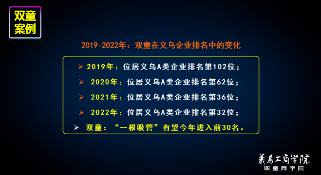 “雙童”目前已經(jīng)孵化出17個(gè)版塊的自主經(jīng)營(yíng)體,并裂變出15家員工創(chuàng )業(yè)體公司,并在2021年到2022年的兩年時(shí)間里,通過(guò)不斷挖掘“未被滿(mǎn)足的客戶(hù)需求”,使整體銷(xiāo)售額復合增長(cháng)了107.02%,相當于用創(chuàng )業(yè)平臺“再造”了一個(gè)“雙童”。憑借此,“雙童”今年有望進(jìn)入義烏企業(yè)前30名。