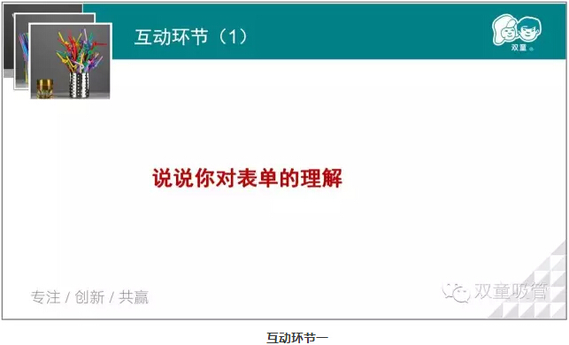 學(xué)習會(huì )當然少不了互動(dòng)啦!這不,一開(kāi)場(chǎng)互動(dòng)就開(kāi)始啦!說(shuō)說(shuō)你對表單的理解?話(huà)題剛落,童鞋們就爭先恐后地回答問(wèn)題啦!表單是結算的依據、表單可以記錄信息...... 大家的答案都層出不窮,不過(guò)很有道理呢!