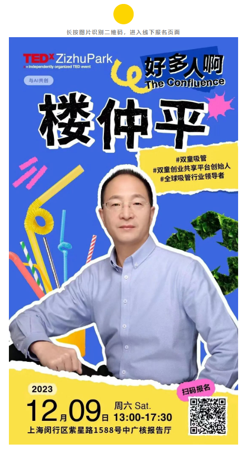 “雙童”創(chuàng )始人樓仲平作為企業(yè)家,關(guān)注員?生活與工作的每?處細節,在成為吸管行業(yè)領(lǐng)導者的同時(shí),還打造了一家“花園式”工廠(chǎng),在推動(dòng)工廠(chǎng)節能減排建設中做了很多的努?。TEDxZizhuPark組織方敏銳地捕捉到其在商業(yè)領(lǐng)域的成就,特邀作為開(kāi)場(chǎng)嘉賓演講人分享。