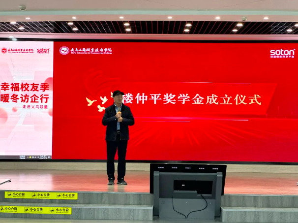 12月12日,義烏工商職業(yè)技術(shù)學(xué)院舉行“幸福校友季·暖冬訪(fǎng)企行”系列活動(dòng),校黨委書(shū)記李昌祖一行走進(jìn)“雙童”深入調研,并舉行教育基金捐贈儀式和【樓仲平獎學(xué)金】設立儀式!