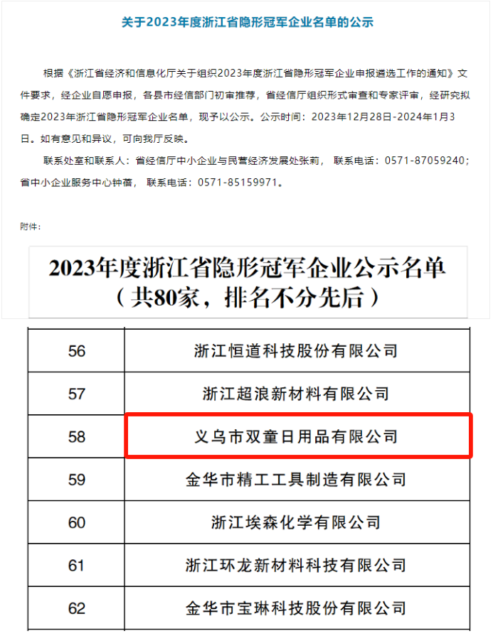 近日,浙江省經(jīng)濟和信息化廳經(jīng)過(guò)多種形式審查和專(zhuān)家評審,最終向社會(huì )公示了2023年度浙江省隱形冠軍企業(yè)擬確定名單,義烏市雙童日用品有限公司成功上榜!