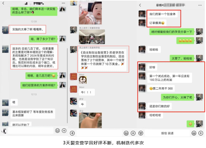 而且現在已有很多學(xué)員,通過(guò)這套機制,取得了喜人的成績(jì)。 1、學(xué)員運用創(chuàng )業(yè)裂變機制,4個(gè)月成效顯著(zhù),想復訓深度學(xué)習; 2、學(xué)員建立經(jīng)營(yíng)體,短短3個(gè)月讓組織架構變得更高效,不僅降本增效,還讓員工獎金拿到手軟; 3、有的創(chuàng )業(yè)體試點(diǎn)成功,訂單爆滿(mǎn),第一年賺100萬(wàn),第二年再干300萬(wàn);