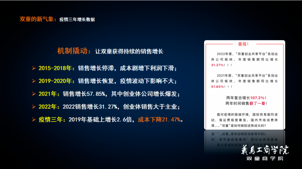 這里的“平臺”正是公司在2018年通過(guò)自主制創(chuàng )業(yè)裂變機制搭建的雙童創(chuàng )業(yè)共享平臺。