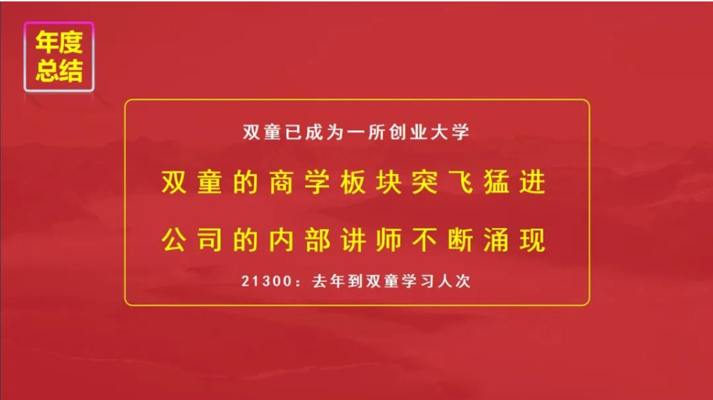 現下,通過(guò)自主制創(chuàng )業(yè)裂變機制,“雙童”除了吸管板塊,外貿、供應鏈、文化傳媒、財務(wù)咨詢(xún)等等各個(gè)板塊遍地開(kāi)花!尤其是雙童商學(xué)院,在2023年取得了飛速地增長(cháng),累計接待了21300人次到“雙童”學(xué)習!