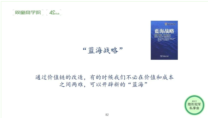 企業(yè)要如何開(kāi)辟新的“藍海”?鄧博士在課上給出了一種開(kāi)辟新市場(chǎng)的戰略行動(dòng)—“藍海戰略”。企業(yè)可以通過(guò)“加減乘除”的方法在優(yōu)化價(jià)值表現的同時(shí)優(yōu)化成本結構,走出“價(jià)值-成本兩難” ,在客戶(hù)特別“講究”的一兩個(gè)利益點(diǎn)上做得特別突出;在客戶(hù)必須的那些利益點(diǎn)上保持一定水準;在客戶(hù)可以“將就”的利益點(diǎn)上降低投入,這樣就可以為企業(yè)開(kāi)辟一個(gè)新的藍海,可以在一定時(shí)期內享有近乎壟斷的市場(chǎng)地位,但這種壟斷是暫時(shí)的。