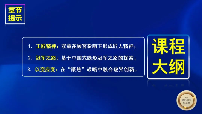 在交付過(guò)程中,樓仲平老師將課程分為工匠精神、冠軍之路和“以變應變”三大模塊,闡述“雙童”在隱形冠軍探索道路上所經(jīng)歷的各個(gè)周期,并進(jìn)行歸納和提煉,以提供在新產(chǎn)業(yè)環(huán)境下中小企業(yè)戰略發(fā)展的探索和思考。