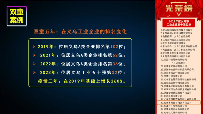 今年是雙童30周年,那么小的一個(gè)產(chǎn)品,我們把它做到了“義烏工業(yè)企業(yè)五十強”第32名,產(chǎn)品的質(zhì)量越來(lái)越好。這就是管理學(xué)轉化和應用。這件事情看似是投入,看似一層一層所謂的我的善和我的愛(ài),實(shí)則是我通過(guò)這種愛(ài)和善的方式交換了員工的心,交換了他們的付出,企業(yè)自然越來(lái)越好。