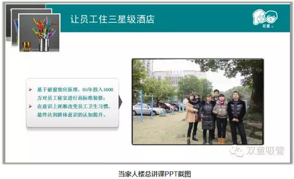當家人樓總坦言“雙童”其實(shí)很簡(jiǎn)單,做企業(yè)的人就應該實(shí)實(shí)在在的把企業(yè)做好,敬天愛(ài)人,回歸商業(yè)本質(zhì)!通過(guò)硬件的提升、學(xué)習會(huì )等形式潛移默化地影響員工,通過(guò)這樣的教育改變員工的意識形態(tài)。