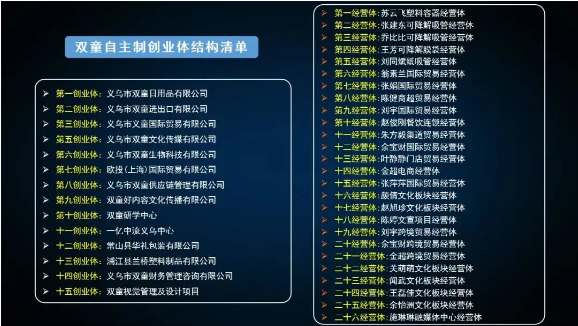 目前,在“雙童”一共做出了15家創(chuàng )業(yè)體公司和26家經(jīng)營(yíng)體板塊,有40多位員工成為了我們創(chuàng )業(yè)體公司的股東。