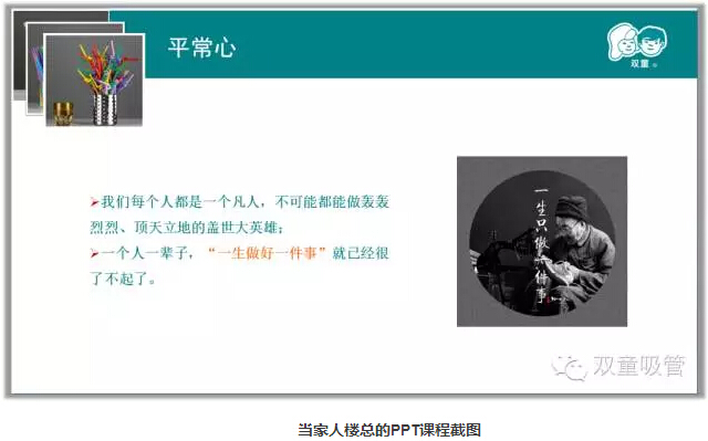 當家人樓總分享:許多人做事情,做著(zhù)做著(zhù)就想做中國第一,世界第一。天底下哪有這么多的“第一”?十三億人難道就會(huì )有十三億個(gè)“第一”嗎?與其天天想著(zhù)和別人爭得頭破血流,還不如找到一個(gè)細分領(lǐng)域,專(zhuān)注地做下去,一生做好一件事,就已經(jīng)很好了。 這就是我經(jīng)常說(shuō)的,也是最難做到的“平常心”!