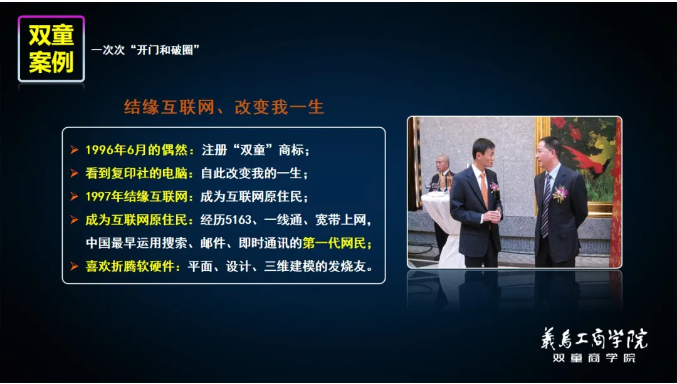 早在1996年注冊“雙童”商標時(shí),自己就開(kāi)始學(xué)習電腦應用,成為中國互聯(lián)網(wǎng)的原住民。并在數字化工具加持下,為“雙童”率先打開(kāi)了國際市場(chǎng),短短幾年時(shí)間,超越同行,奠定了成為行業(yè)冠軍的基礎。