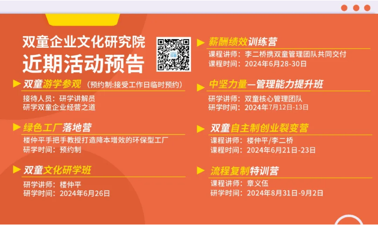 早在2022年,雙童商學(xué)院就針對該機制打磨成《自主制創(chuàng )業(yè)裂變營(yíng)》課程,并不斷地升級迭代,以助力更多中小企業(yè)也能運用這套機制實(shí)現快速增長(cháng)!