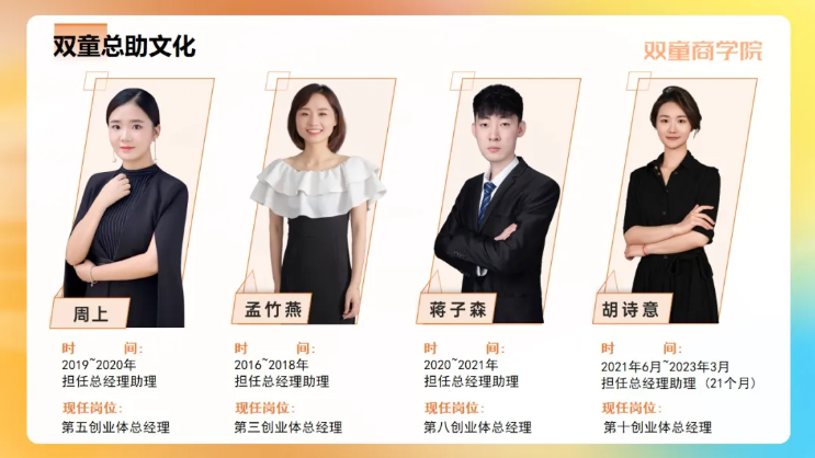 憑借一己之力成為雙童招聘“半壁江山”的蘇紀林、從基層一線(xiàn)員工成為總經(jīng)理的李二橋、從內勤崗位成長(cháng)為經(jīng)營(yíng)體體長(cháng)的關(guān)萌萌、在助理文化下完成創(chuàng )業(yè)夢(mèng)想的多位總經(jīng)理……類(lèi)似的案例,在“雙童”不勝枚舉!
