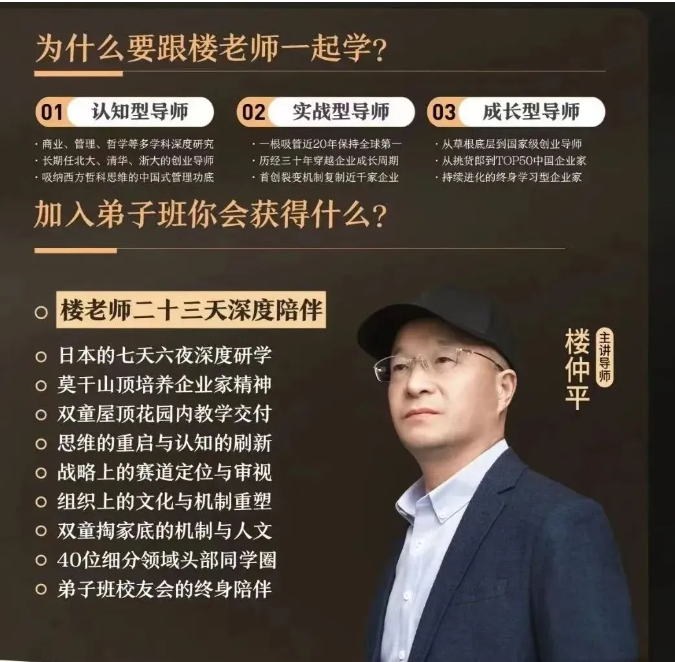 如果你是創(chuàng )業(yè)者、學(xué)習者、思想者,希望在經(jīng)營(yíng)領(lǐng)域有自己的思考和洞察,那么樓仲平【弟子班】就是為你量身定制,今年最后一期招生,一班只招40位同學(xué),名額所剩不多,抓緊機會(huì )哦!