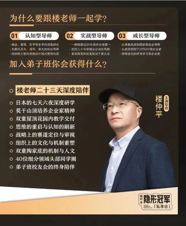 歡迎您走進(jìn)「樓仲平·弟子班」課堂,在樓仲平老師的陪伴下,學(xué)習借鑒雙童30年的成功的經(jīng)驗積累,助力您在創(chuàng )業(yè)路上更加順遂,在遇到抉擇時(shí)能做出更加理性的判斷!