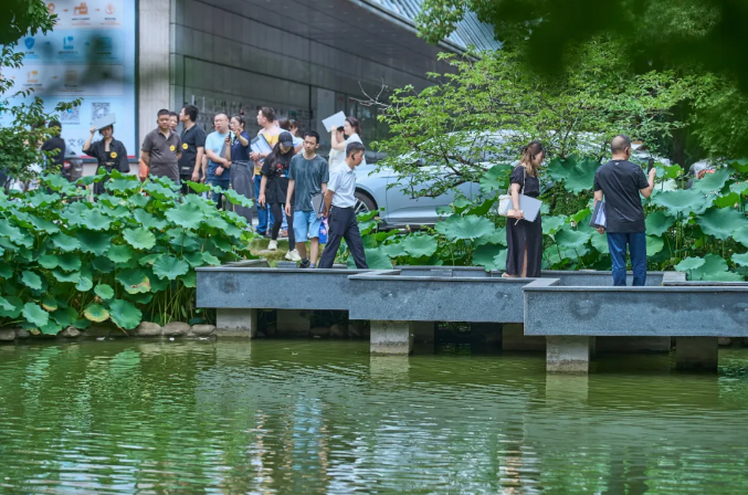 傍晚,員工們三兩成群漫步橋畔,沉醉荷池美景。聽(tīng)瀑布潺潺,看斜陽(yáng)映水,魚(yú)兒游弋添生機。時(shí)光寧靜美好,幸福感滿(mǎn)溢,令人向往,愜意無(wú)比!