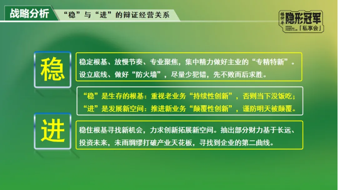 中國社會(huì )經(jīng)濟歷經(jīng)幾十年發(fā)展,經(jīng)歷了粗放經(jīng)營(yíng)的“原始積累”階段,做強做大的“快速發(fā)展”階段。現階段已進(jìn)入到“專(zhuān)精特新”轉型和創(chuàng )新階段,真正能挨過(guò)一個(gè)個(gè)經(jīng)濟寒冬并實(shí)現基業(yè)長(cháng)青的企業(yè),一定是極致專(zhuān)注,并在某一細分領(lǐng)域處于絕對領(lǐng)先地位的隱形冠軍和產(chǎn)業(yè)小巨人。
