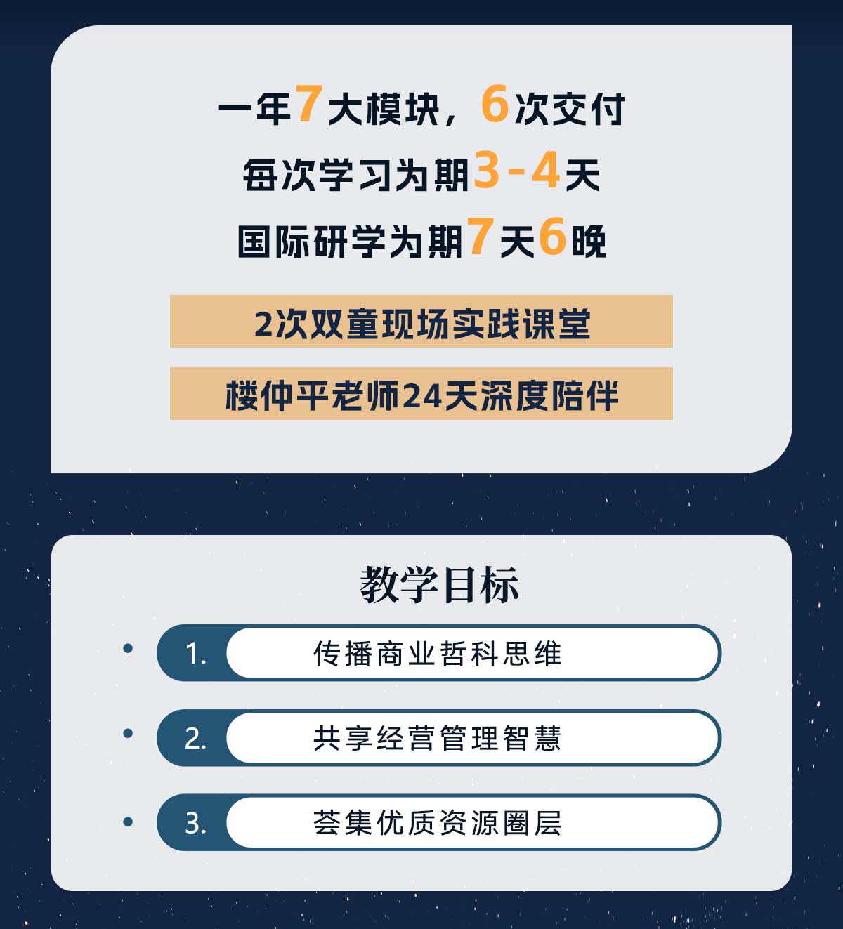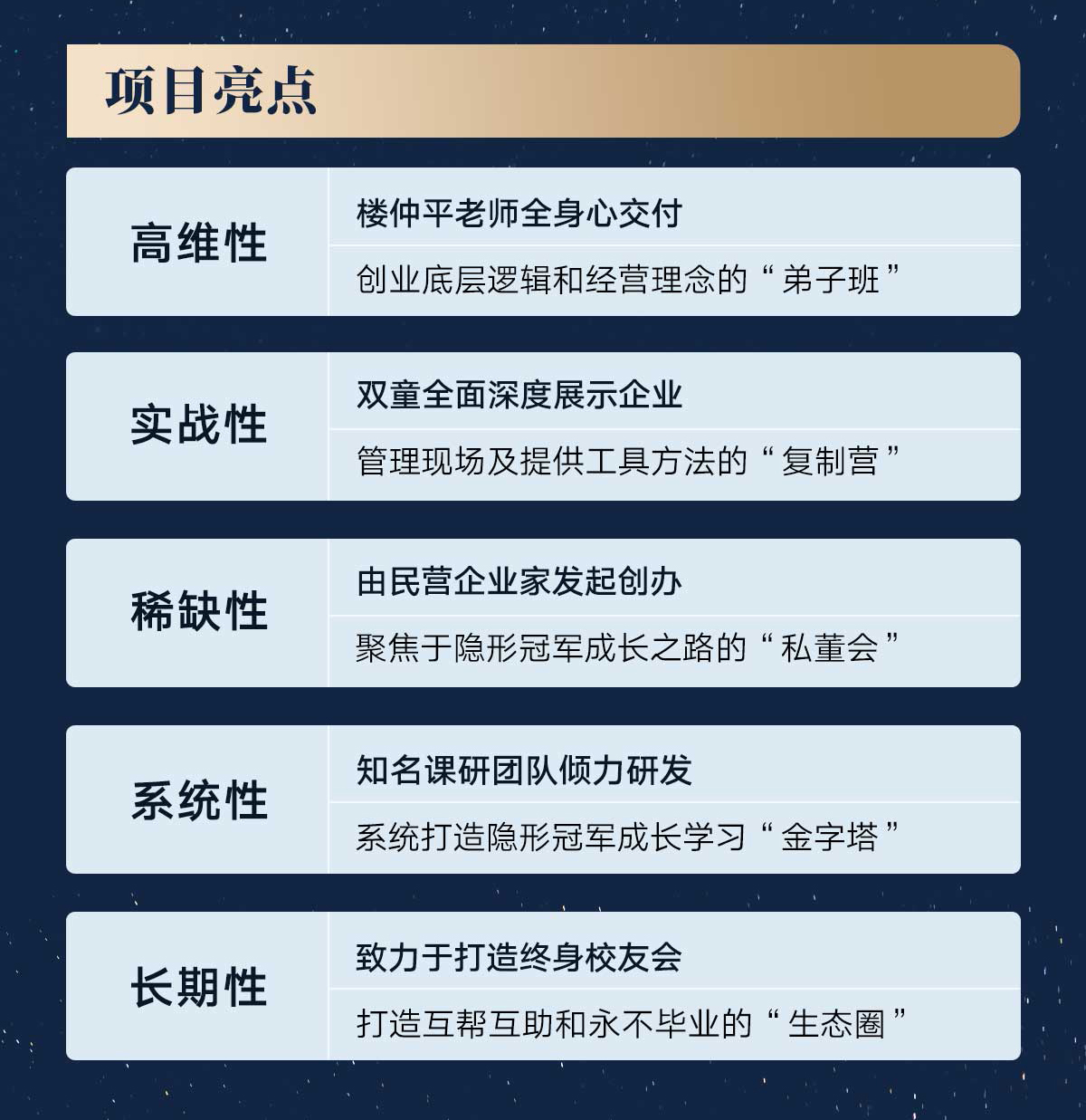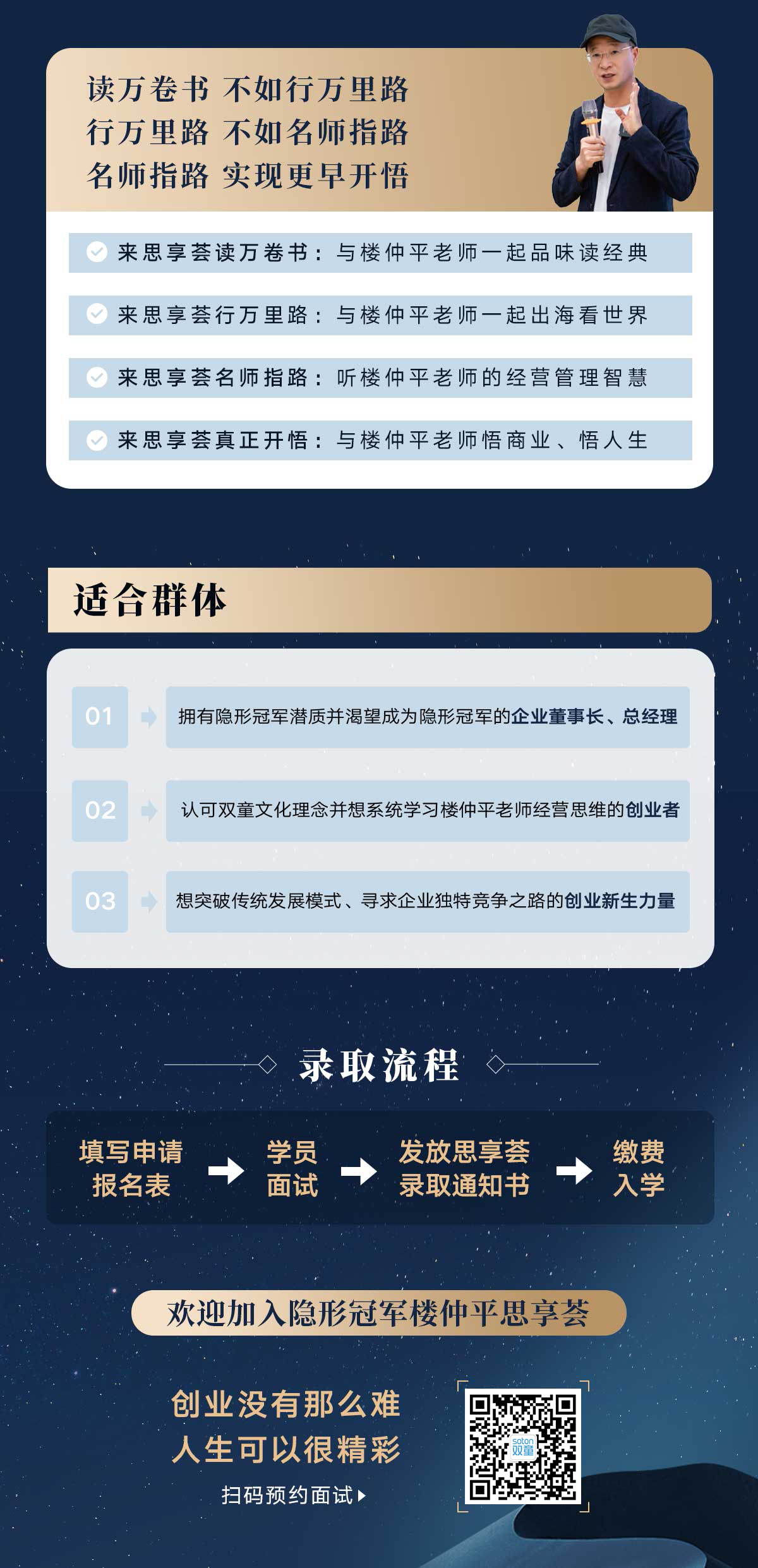 如果你是創(chuàng )業(yè)者、學(xué)習者、思想者,希望在經(jīng)營(yíng)領(lǐng)域有自己的思考和洞察,那么《隱形冠軍樓仲平思享薈》就是為你量身定制,今年最后一期招生,一班只招40位同學(xué),名額所剩不多,抓緊機會(huì )哦!