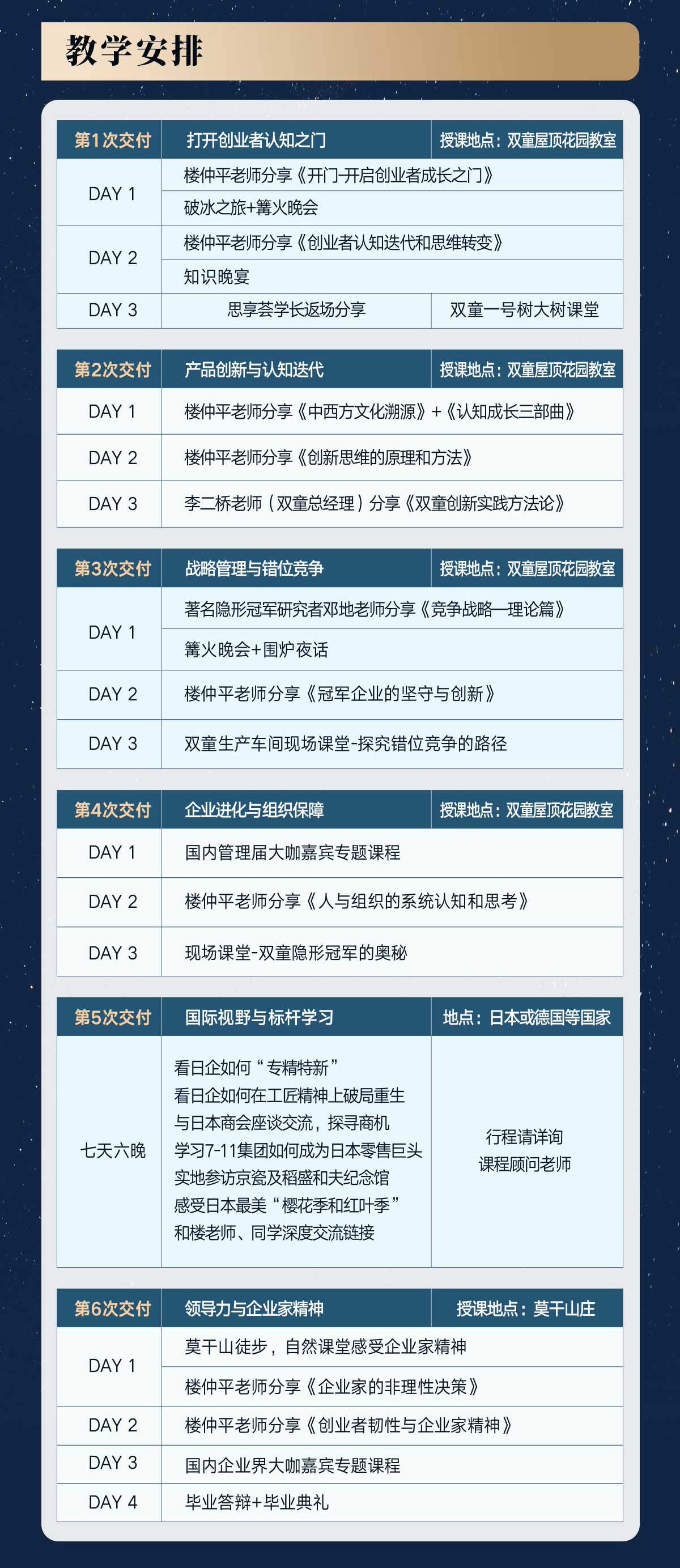 也是樓總唯一一個(gè)全面系統交付46年創(chuàng )業(yè)歷程的經(jīng)驗總結和思維模型的課程。全年6期課程,樓老師24天深度陪伴,從戰略到組織,從創(chuàng )新思維到企業(yè)家精神,幫助你的企業(yè)全方位升級。