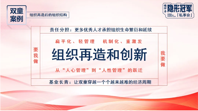 而當下,“雙童”所推行的自主制創(chuàng )業(yè)裂變機制則是通過(guò)撬動(dòng)人性,讓更多優(yōu)秀人才承擔組織生命繁衍和延續,從而讓企業(yè)實(shí)現基業(yè)長(cháng)青!