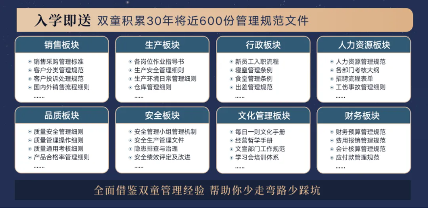 所以,入學(xué)“隱形冠軍樓仲平思享薈”之后,項目組會(huì )將“雙童”積累了30年、包含了銷(xiāo)售、生產(chǎn)、行政、人類(lèi)資源、品質(zhì)、安全和文化管理7大板塊,將近400分管理規范文件,全部打包給學(xué)員,幫助學(xué)員企業(yè)能夠全面借鑒雙童管理經(jīng)驗、少走彎路、少踩坑!