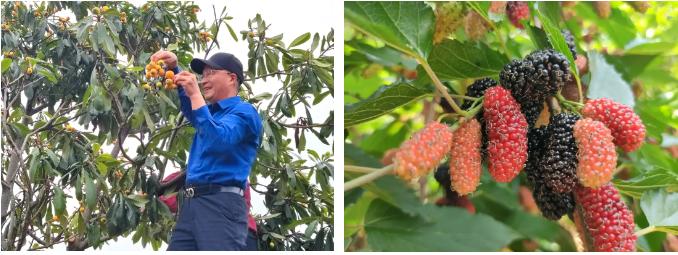 ▲“雙童”的櫻桃樹(shù)上長(cháng)滿(mǎn)了誘人的果實(shí)花園的另一角,紫紅的桑葚和金黃的枇杷也交相輝映,枇杷顆顆粒大飽滿(mǎn),桑葚又像嬌羞的小姑娘,小臉兒的一片,每年春天都“熱鬧”極了!