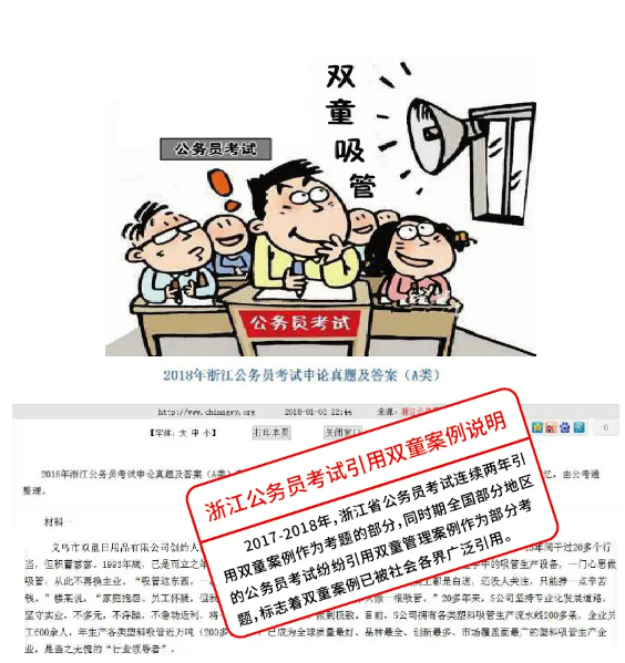 2015年以來(lái),雙童案例逐漸被各大院校MBA大量采用。2016年,雙童案例出現在甘肅、樂(lè )山公務(wù)員和蘭州大學(xué)附中期末考試的試題上,受到《人民網(wǎng)》的關(guān)注和報道。2017年,雙童堅守實(shí)業(yè)的工匠精神成為浙江企業(yè)標桿案例被列入浙江省公務(wù)員考題。