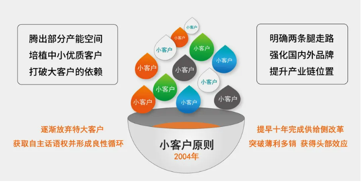 因此,“雙童”推出了小訂單策略,做出規定:要求業(yè)務(wù)員逐步放棄沒(méi)有利潤的大客戶(hù),騰出產(chǎn)能空降培植日本和歐盟的中小客戶(hù);拓展國內高端市場(chǎng)和個(gè)性化定制,形成“兩條腿走路”布局;每個(gè)客戶(hù)的訂貨數量絕不允許超過(guò)本廠(chǎng)生產(chǎn)總量的5%。