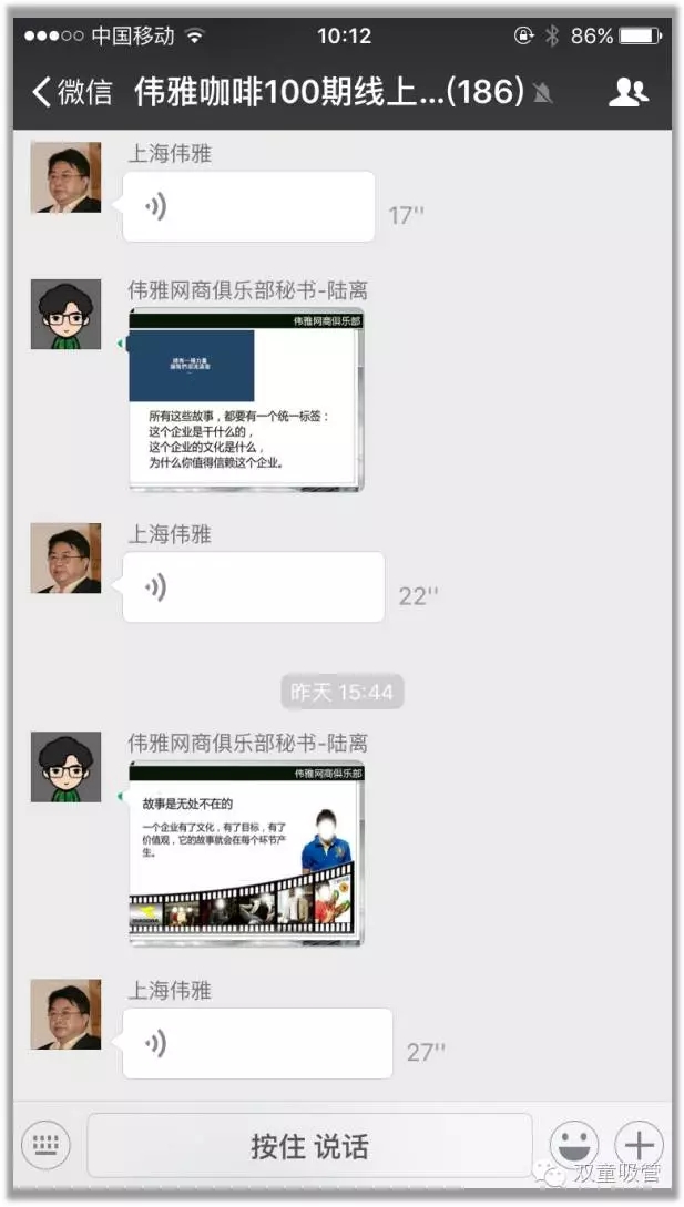 7月27日下午,吸管妞早在微信上預告過(guò)的上海偉雅網(wǎng)商俱樂(lè )部如期開(kāi)始了偉雅咖啡線(xiàn)上沙龍!當家人樓總首次在微信上進(jìn)行線(xiàn)上直播課程,與近200號管理精英分享《雙童”是如何“講故事”的》課程,效果到底如何?我們趕緊來(lái)回顧一下!