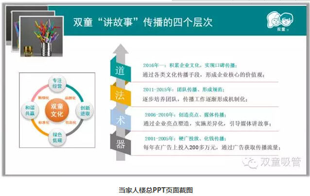 當家人也向大家分享了老子的“器”、“術(shù)”、“法”、“道”四個(gè)層次來(lái)說(shuō)明講故事由低到高的過(guò)程。“器”靠花費廣告費去引進(jìn)流量,“術(shù)”靠亮點(diǎn)的塑造、媒體的傳播,而“法”靠培養團隊,形成規范傳播。“雙童”目前講故事的水平還處在“法”的階段,通過(guò)講故事把文化傳播出去,進(jìn)一步追求“道”的層面,形成企業(yè)核心的價(jià)值觀(guān),形成企業(yè)文化的口碑傳播。